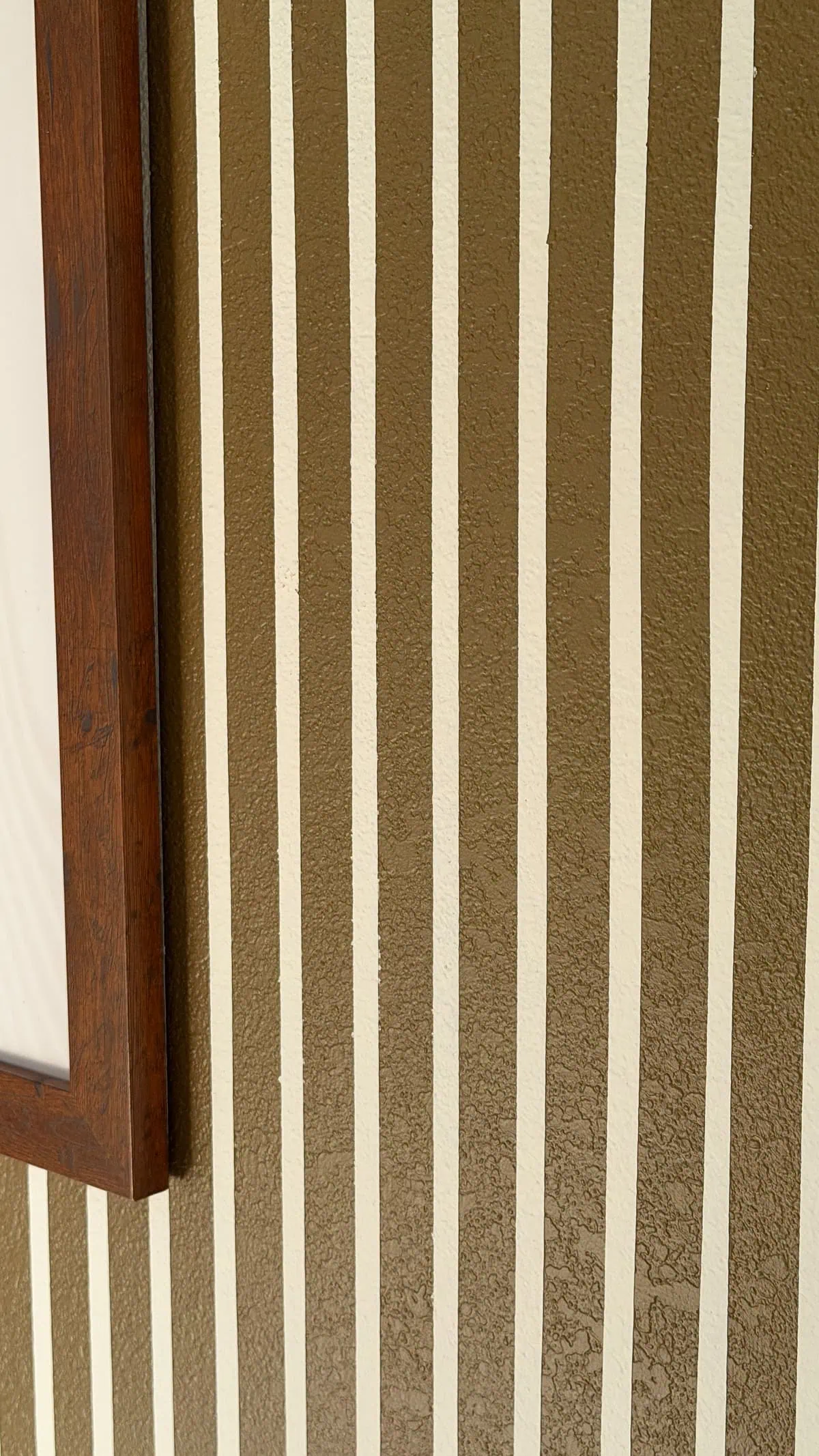 If you’ve ever tried to paint stripes on a textured wall, you know the nightmare: paint bleed. To avoid it, Luke had to be meticulous. We did end up having some paint bleed but it's because of the textured wall and you have to look really closely at an individual stripe to see it. Overall, the tape plus second coat of base color did great and I think the imperfections look like they are meant to be there.